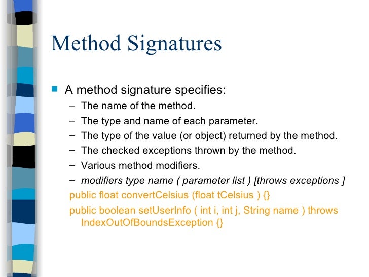 It serves to separate two similar (or overloaded) methods so that. We are starting one by one from top to bottom demonstration of the java program. Java Method Signature - A method signature is part of the method declaration.