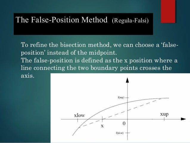 Y Method Of False Position. False Position Method (Regula Falsi) for finding roots of functions. In that case, why not use the root of this linear interpolation as our next.
