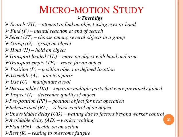 In Methods Analysis A Therblig Is A. D. sometimes increase and sometimes decrease the sample size, depending on the analyst E. impossible to say without additional information. If you begin to conduct work analyses using Therbligs, you will begin to see certain patterns emerge.