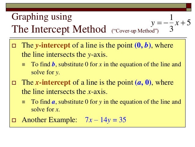 Graph the equation using the intercept method 2x+3y=6 (Lou Patton) How to graph lines using the Slope-intercept form of a line, and how to identify the slope and y-intercept from an equation. Then, write the slope m in the. The x-intercept is where a line crosses the x-axis, and the y-intercept is the point where the line crosses the y-axis.