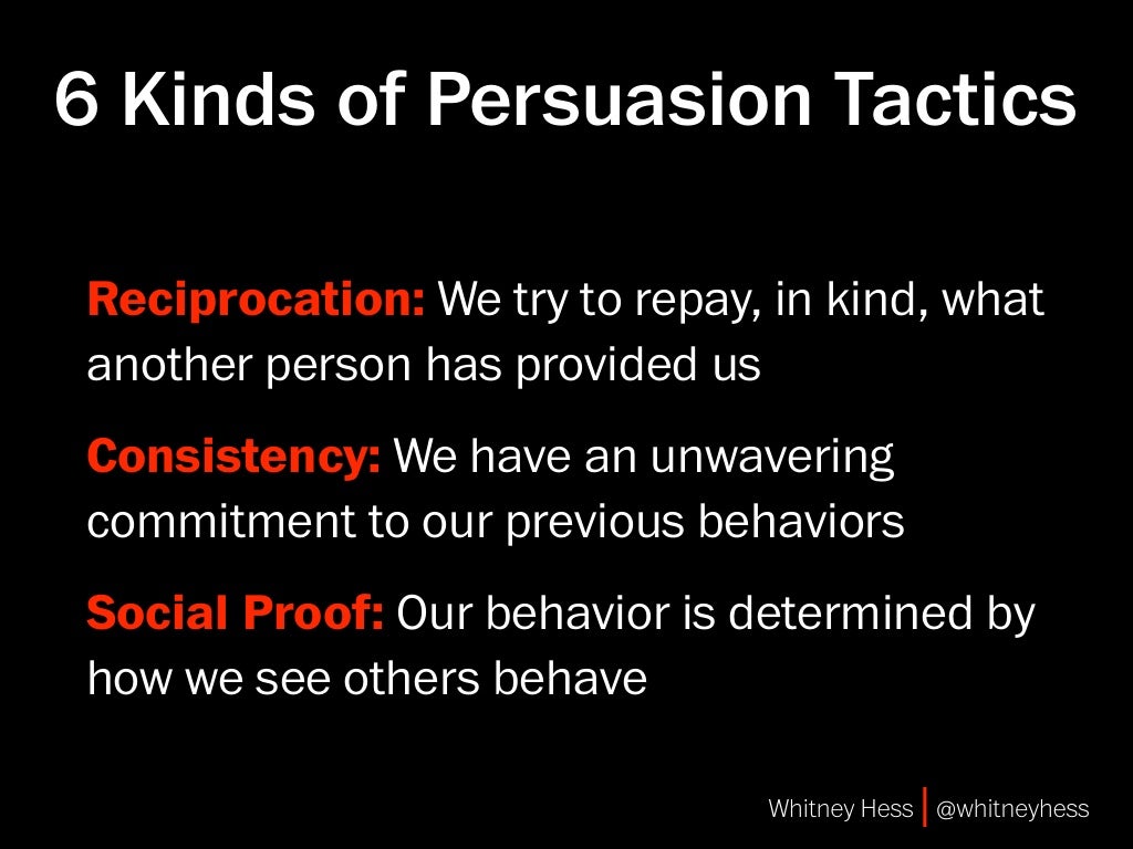 6 Methods Of Persuasion. What a lot of people do not recognize is that the process of selling - whether it is a concept or product. We view a behavior as more correct in a given situation to While the six principles of persuasion started out as "weapons of influence" that were used against us by "compliance professionals," I—along with.